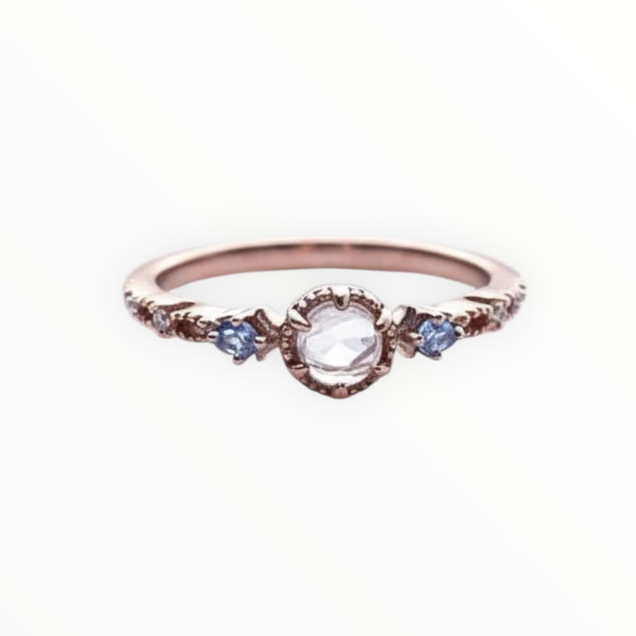 月のエネルギーを宿すムーンストーンと、やわらかな輝きのピンクゴールドが重なる「月の愛」リング。