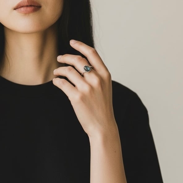 神秘的な光を宿すラブラドライトをあしらったリング。
